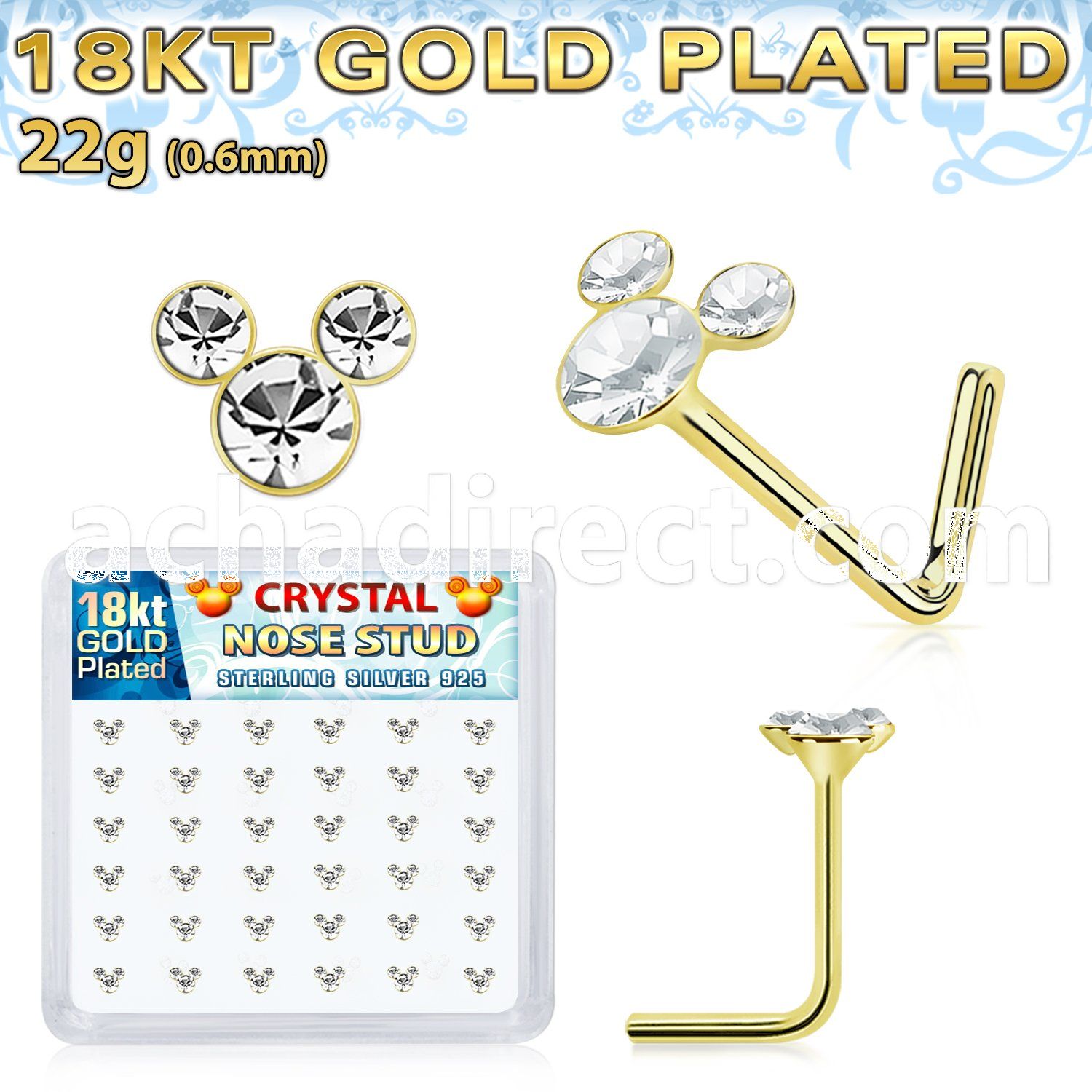 18k Gold Plated Silver Nose Studs with Round Crystals Forming a Mouse Face