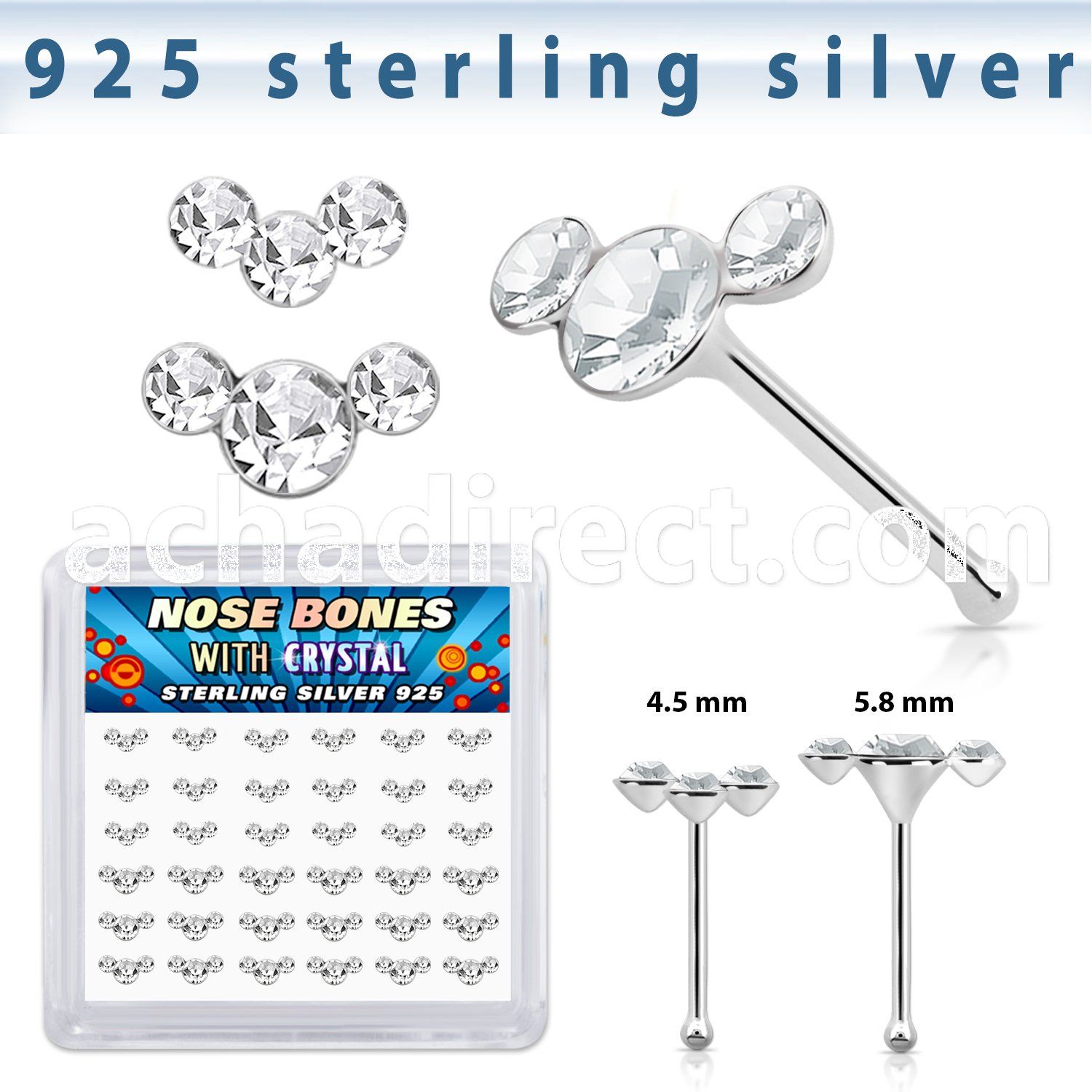 Silver Nose Bones Three Crystals Curved Shape, Display Box