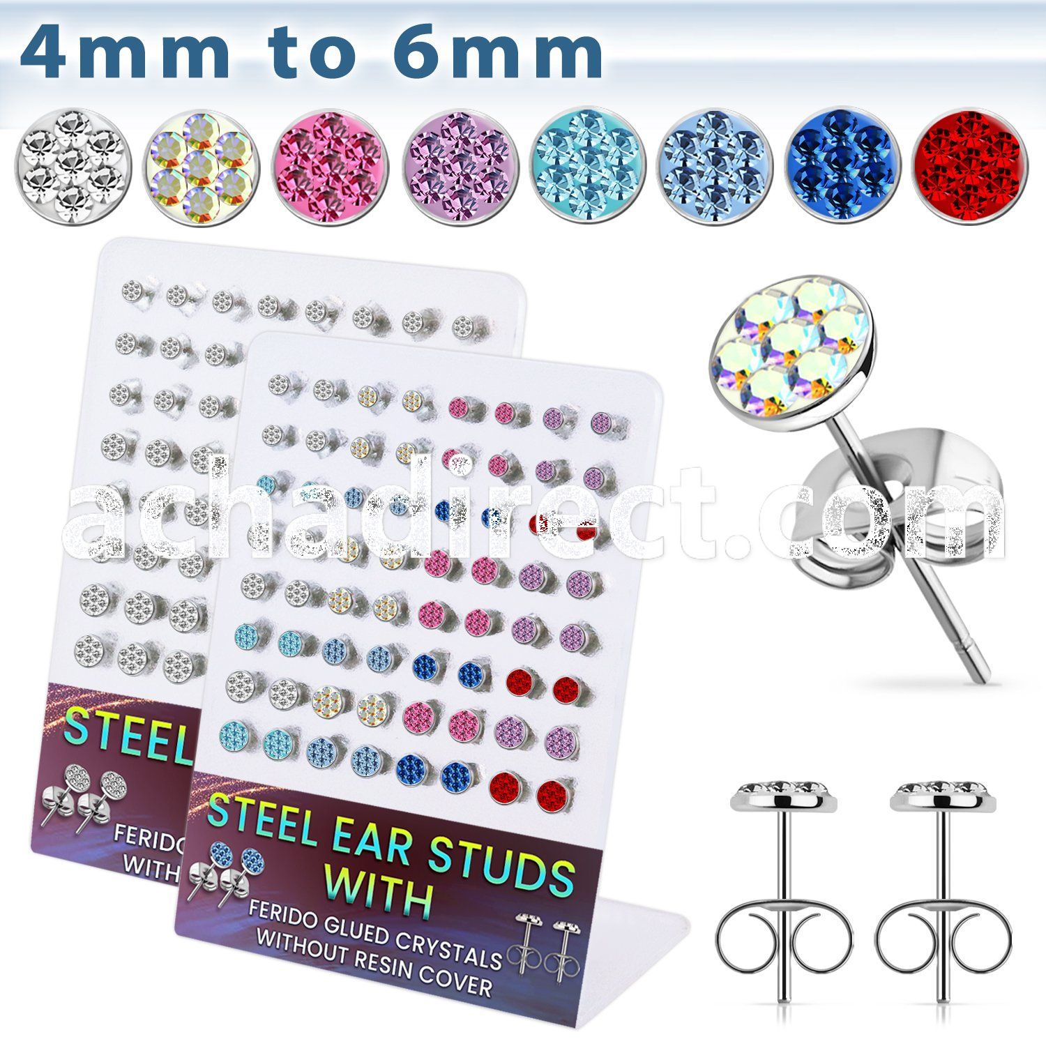 Steel Ear Studs with 4mm to 6mm Ferido Crystals, 32 Pairs