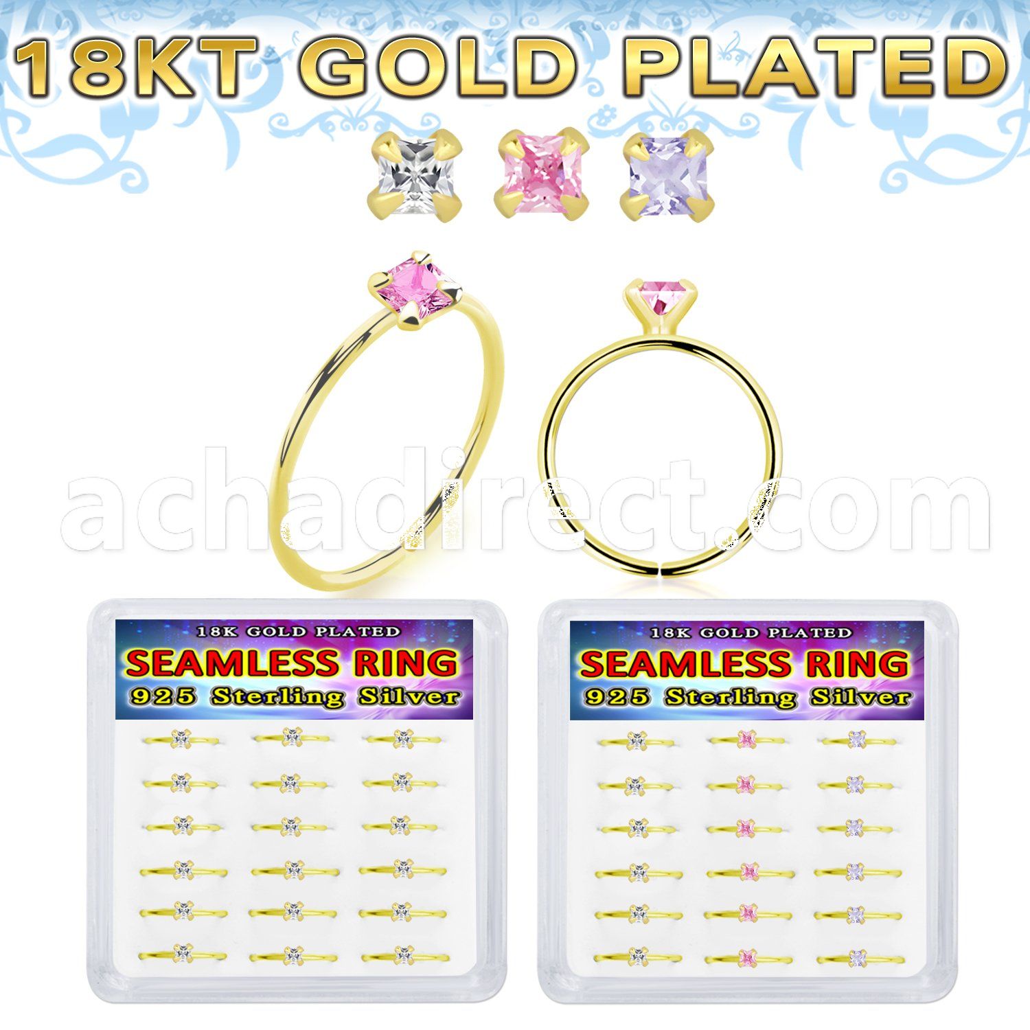 Display 18k Gold Plated Silver Seamless Nose Ring Square CZ