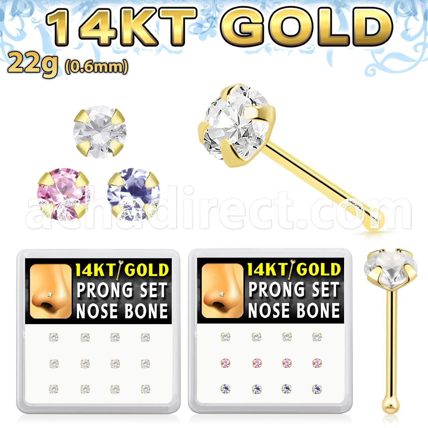 1. dgnb22 box w 12 pcs. of 14kt gold nose bones w 1.25mm clear cz