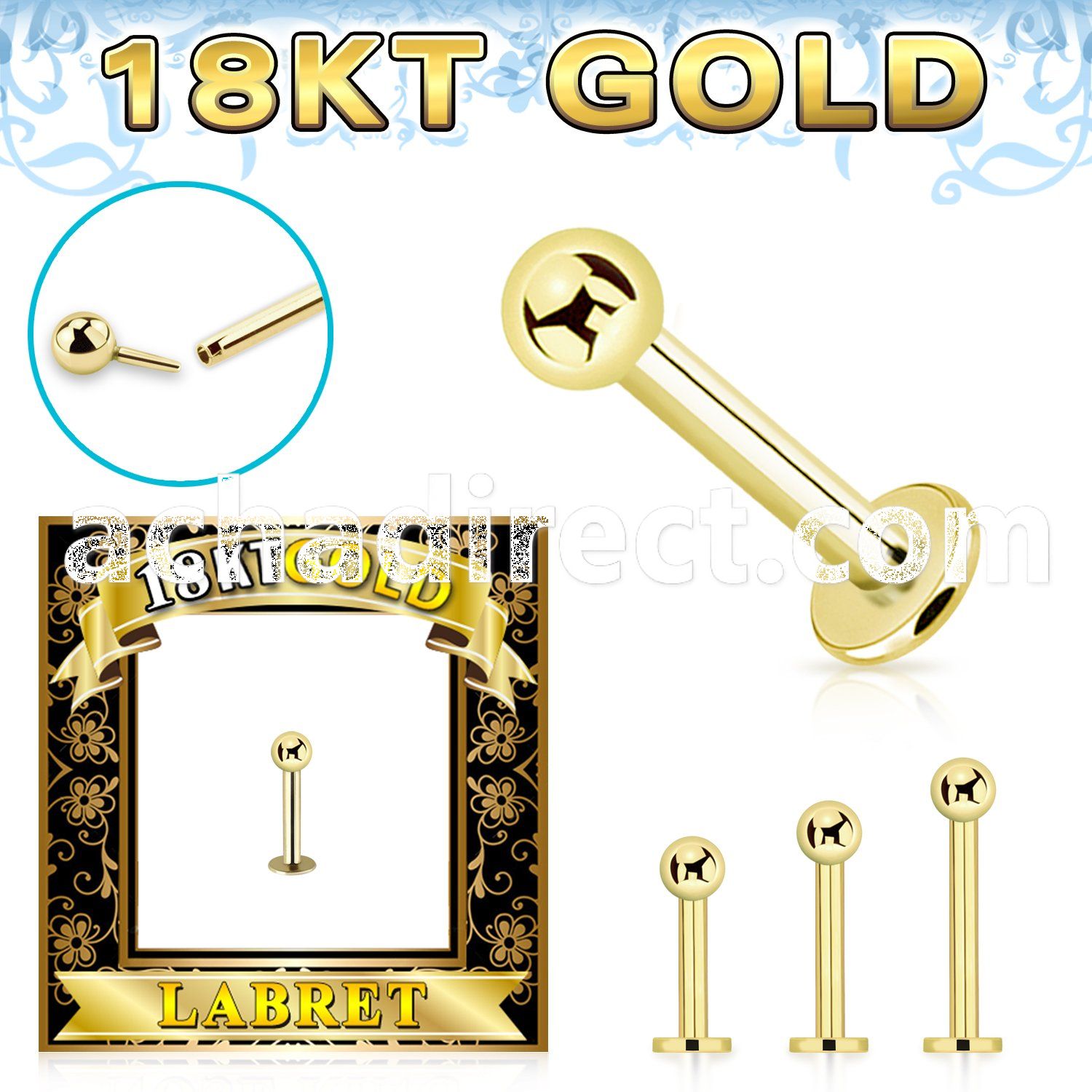 18k Gold Threadless Push Pin Labret with 2.5mm Plain Ball