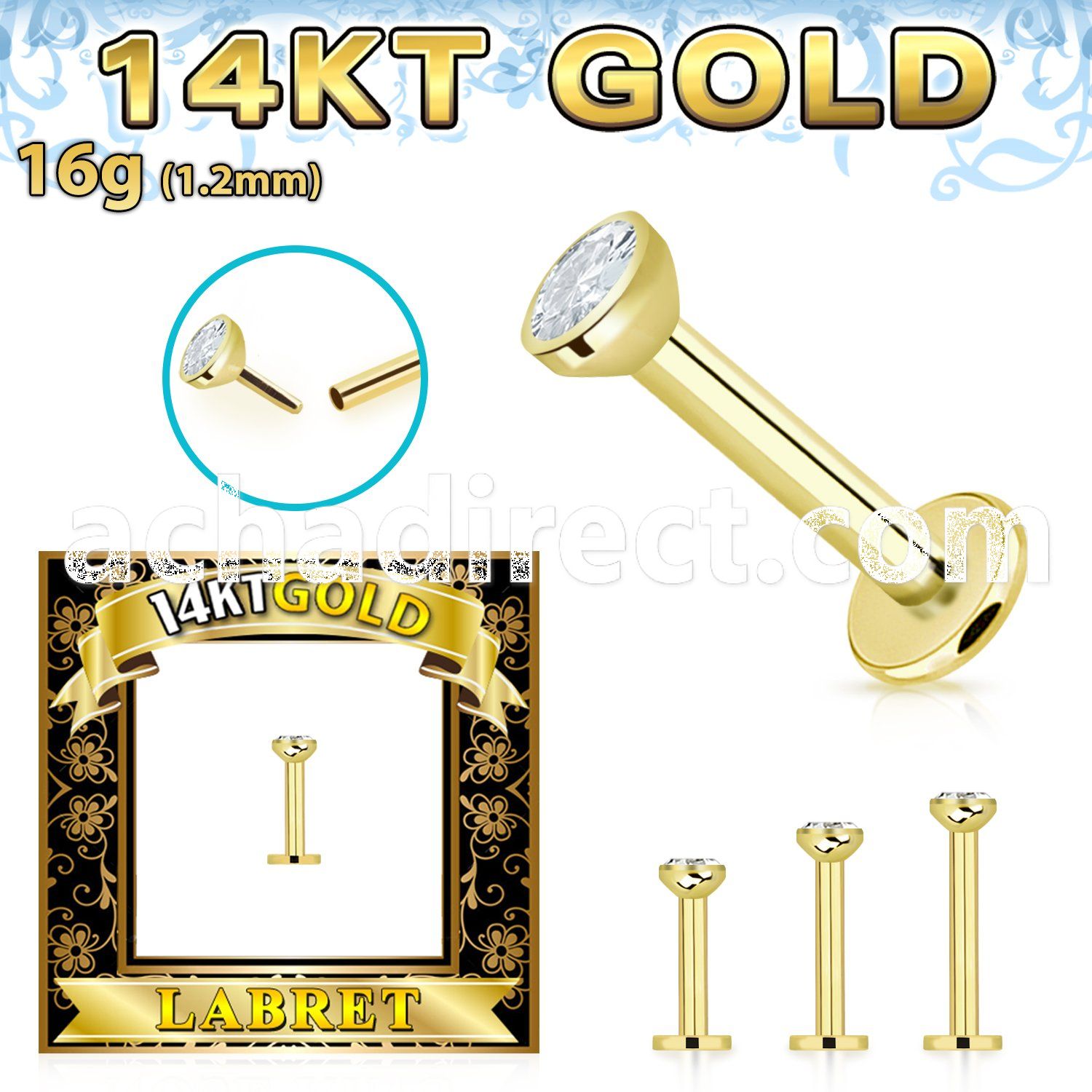 6. glbzx 14k gold labret round clear cz push pin prong