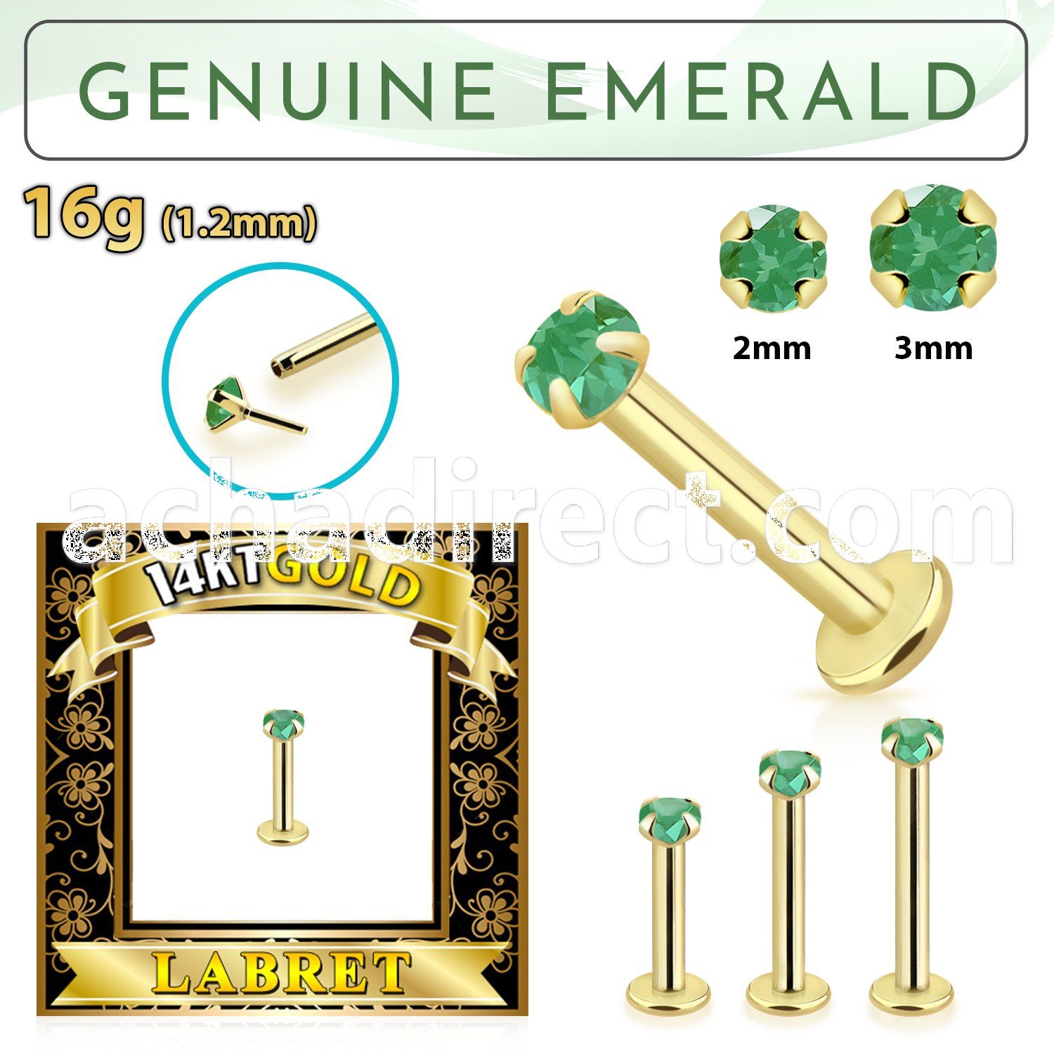 12. bioflex labret with push in 10kt gold w prong emerald