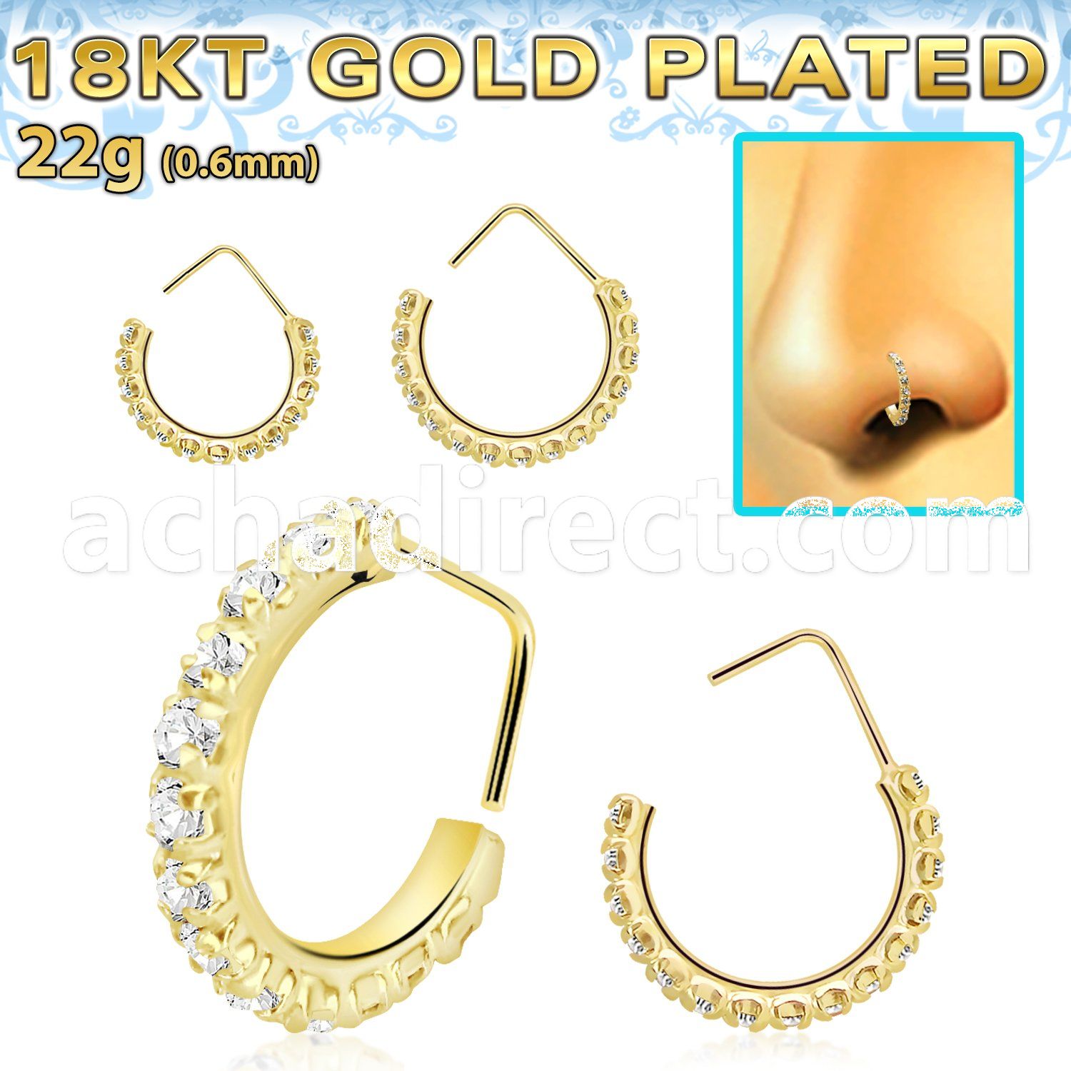 18k Gold Plated Silver Nose Stud with Clear Crystals on Top