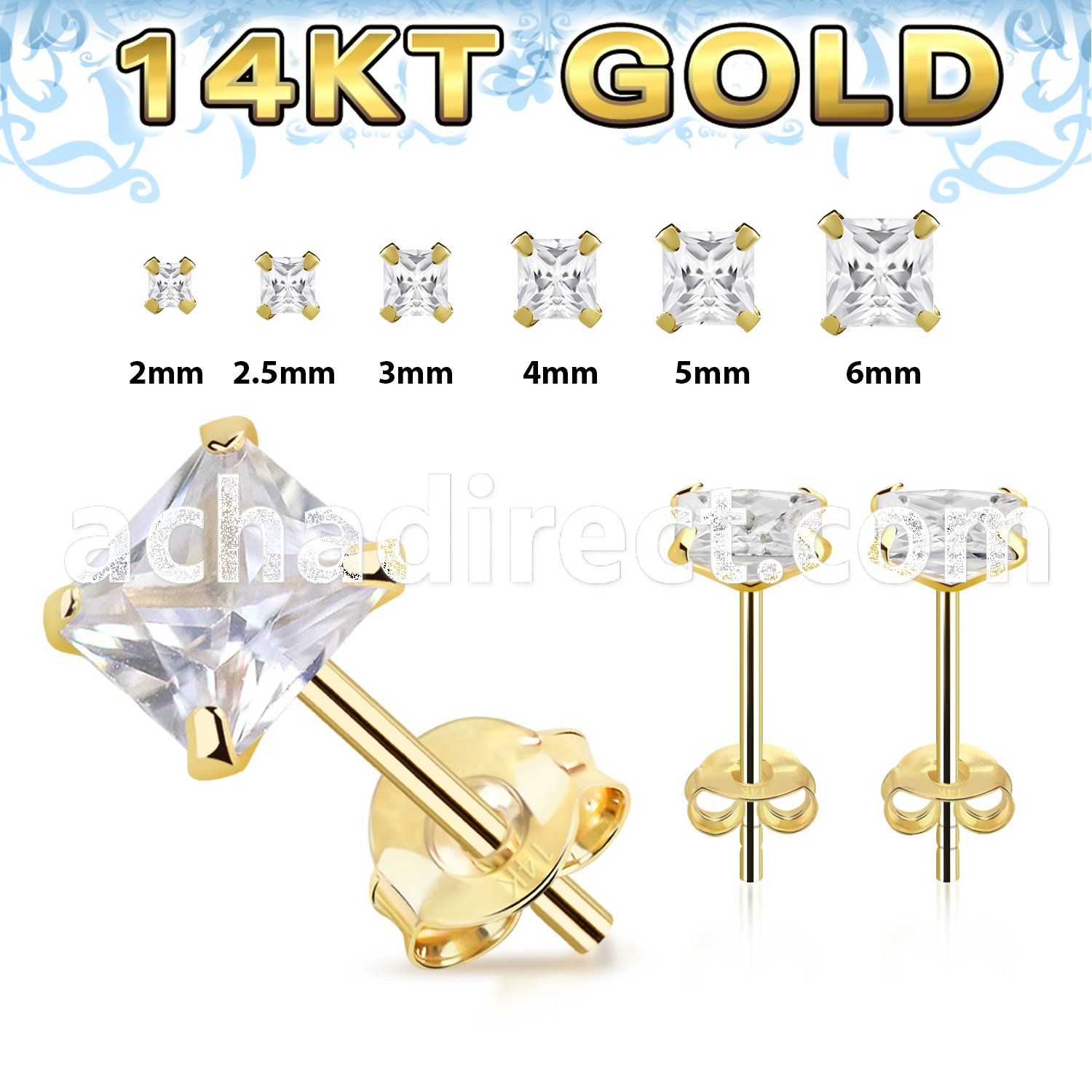 One Pair 14k Gold Ear Studs Square Clear Prong Set CZ Stone
