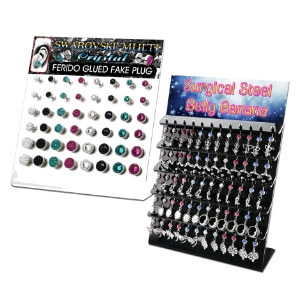 Límmiðarnir á heildsölu body piercing og body jewelry sýningarstöndunum og kössunum geta verið sérsmíðaðir og hannaðir fyrir hverja götunarstofu í online piercing shop okkar. Hönnuðirnir okkar geta sett vörumerki, nöfn, mynstur og jafnvel myndir á þá. Að auki má fylla þessa götunar sýningarstanda og kassa með völdum vörum. Vertu í sambandi við okkur til að ræða möguleikana.