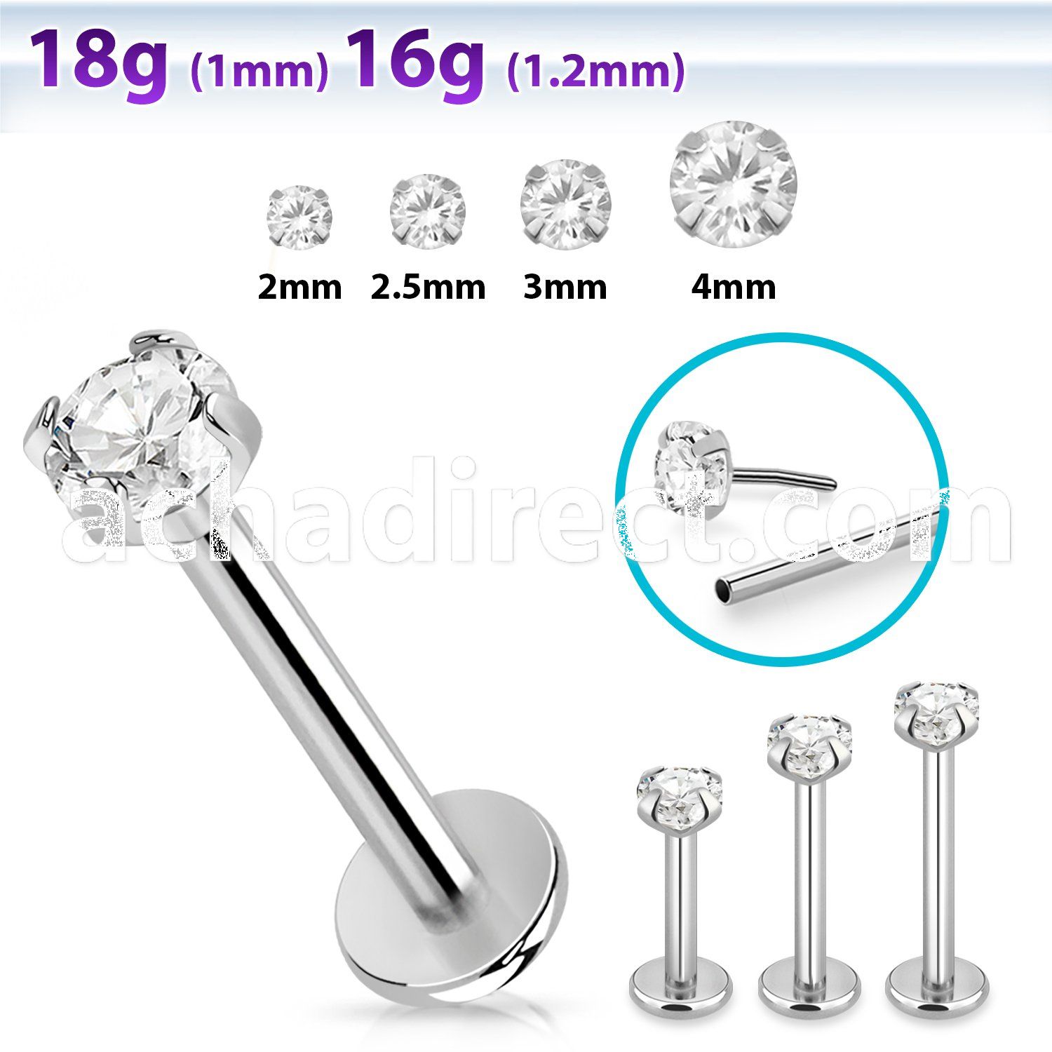 316L Surgical Steel Threadless Push Pin Labret with 4mm Base Plate and 2mm to 4mm Prong-set CZ Stone