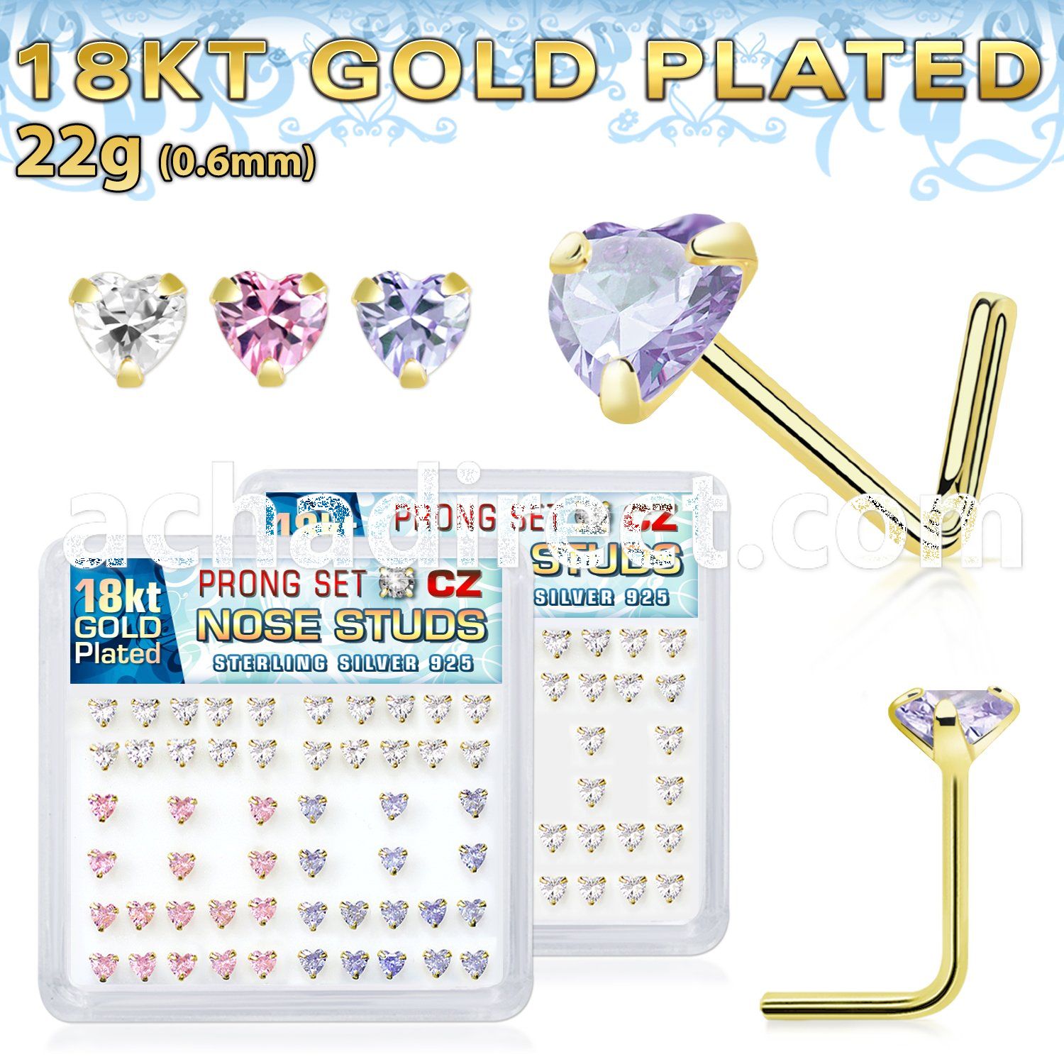 18k Gold Plated Silver Nose Studs with Heart Design CZ Stone in Display Box