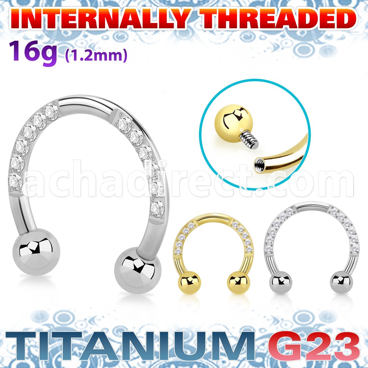 High Polish and Gold PVD Titanium Horseshoe Circular Bar with Two 3mm Balls and Pave Set Forward Facing CZ Stones