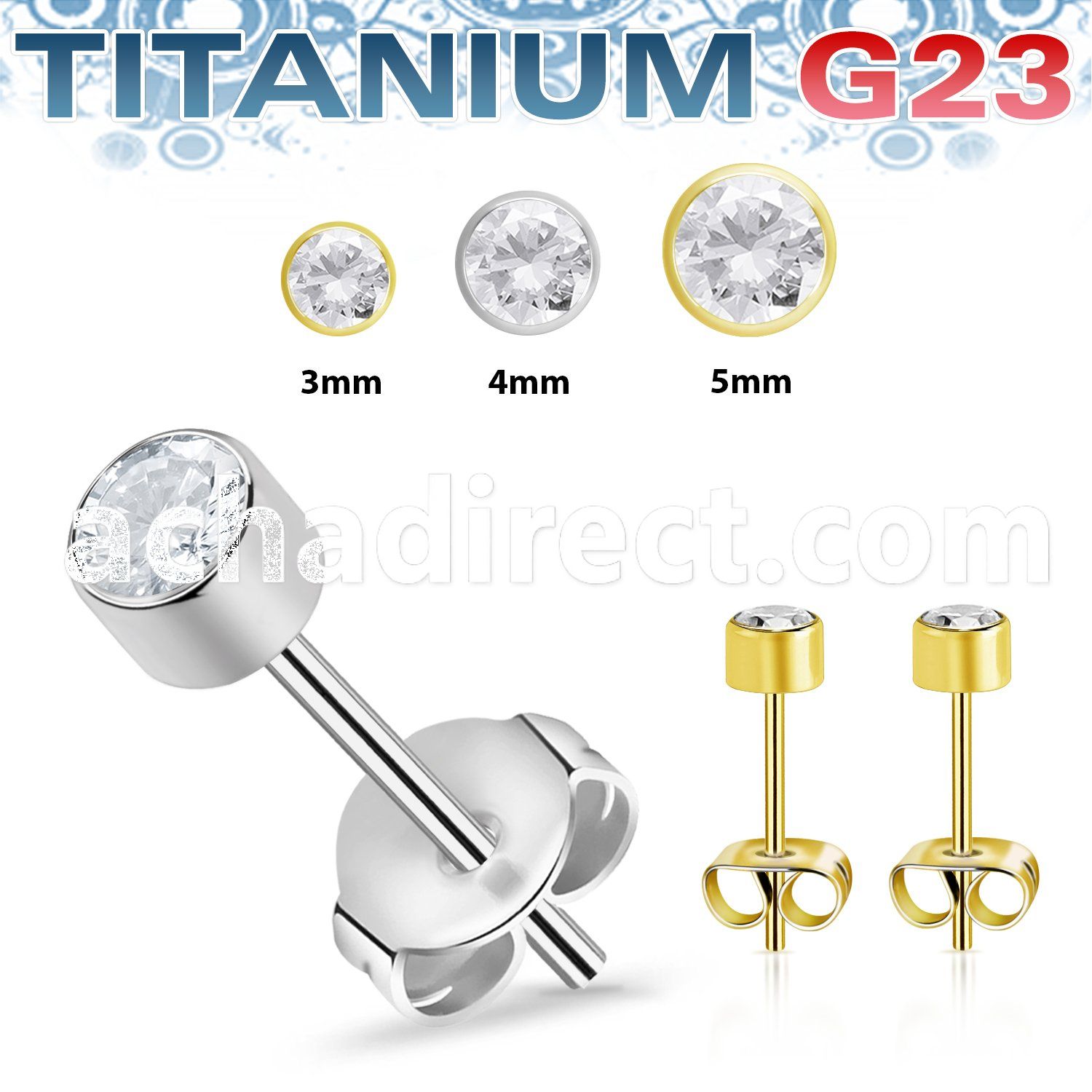 One Pair High Polish and PVD Plated Titanium Ear Studs Bezel Set CZ Stone