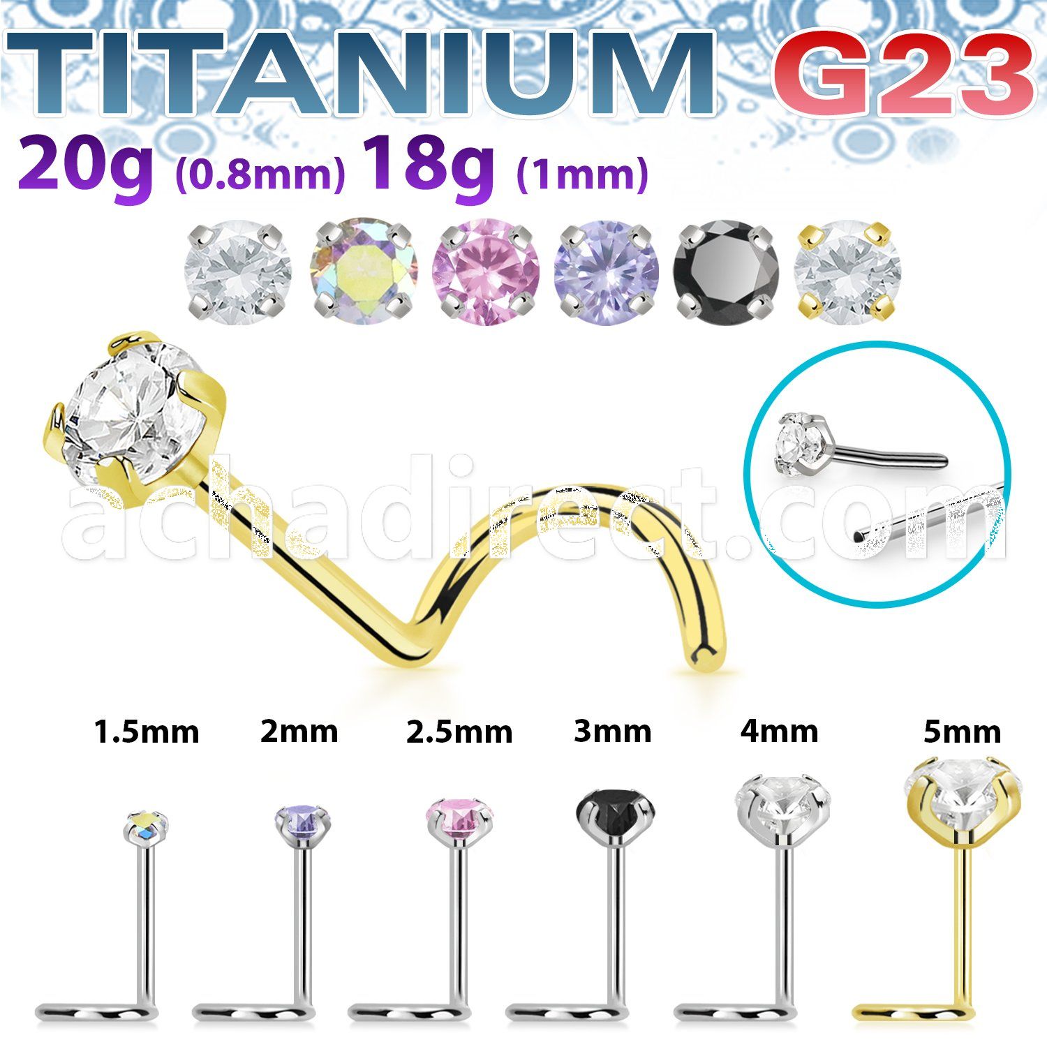 3. anodized titanium g23 nose screw, 18g w bezel set crystal