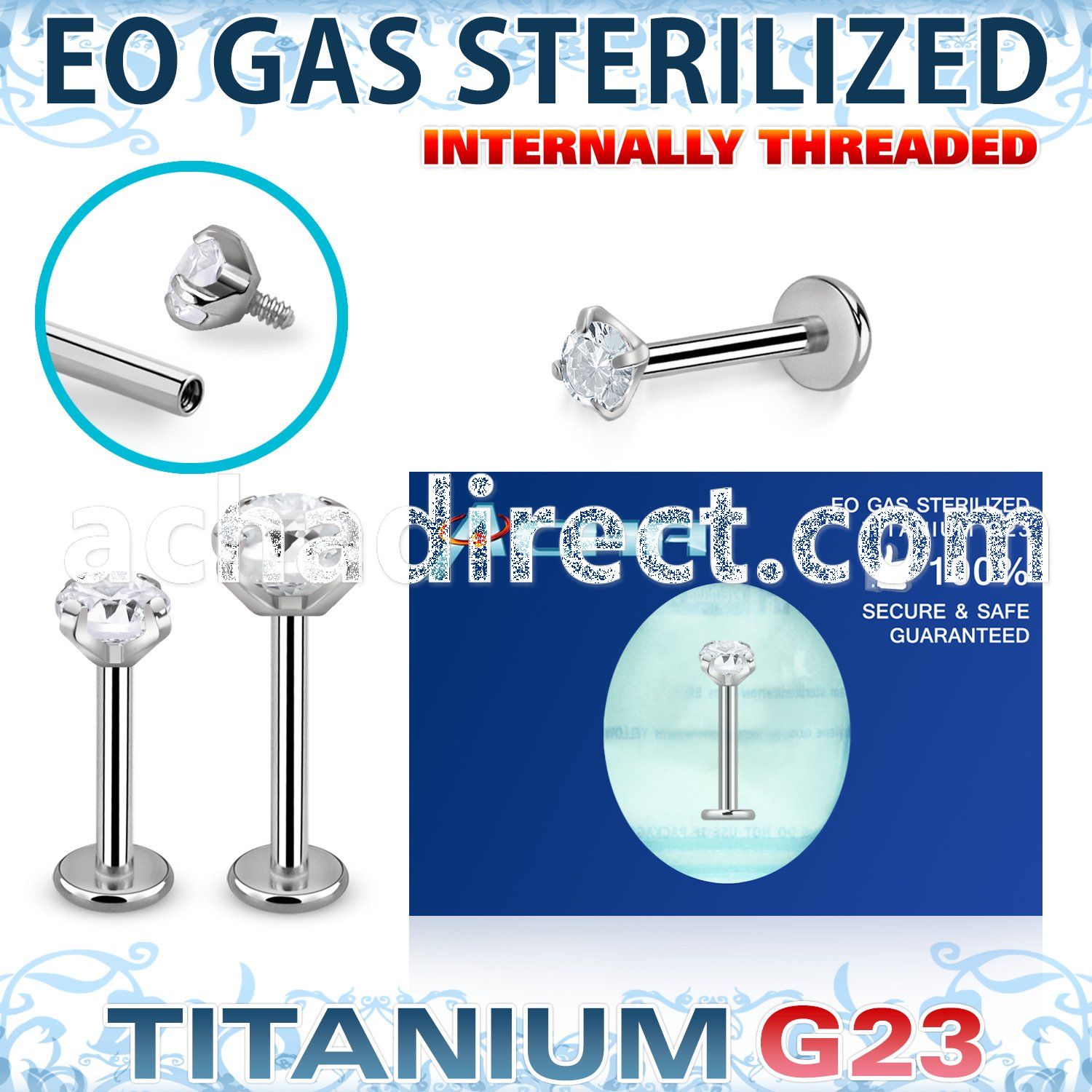 EO Gas Sterilized Titanium Internally Threaded Labret CZ Stone